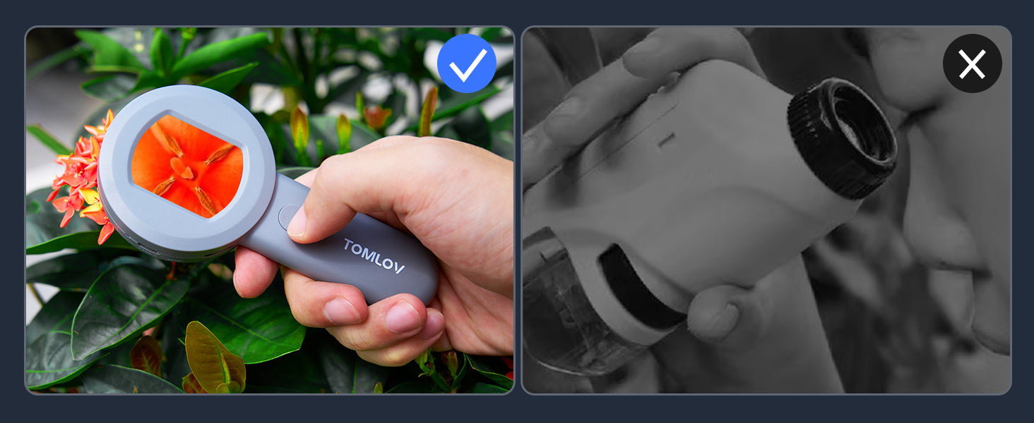 Simple to use--Power on the mini scope, place the illuminated magnifier about 0.3 inches from the object, and you'll get a clear 100x magnified image!
