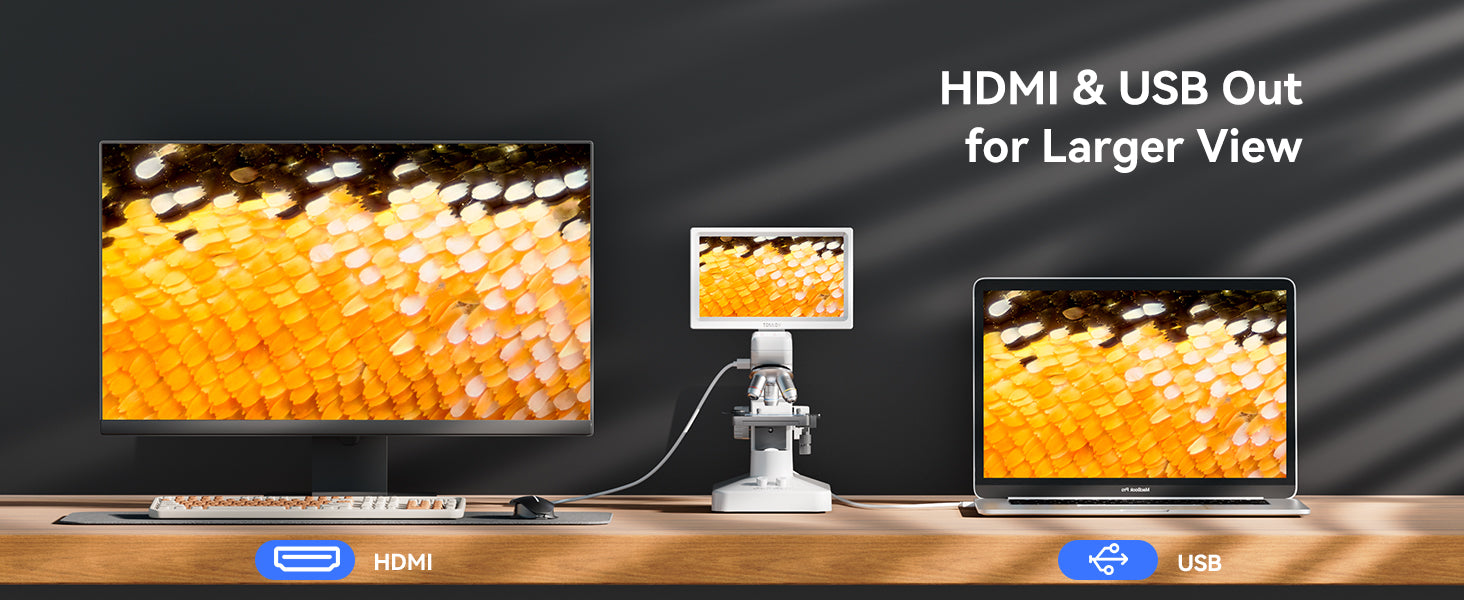 HDMI & USB outputs enable live display or recording—perfect for teaching and collaborative research.