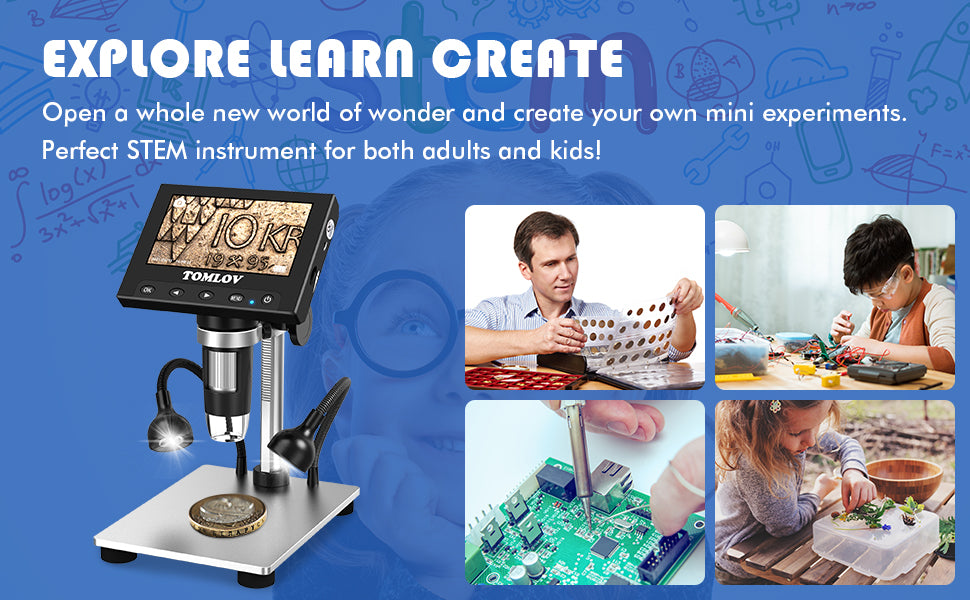 With the powerful camera sensor, practical functions and metal construction, this microscope is also ideal for adults, repairing electronics, soldering PCB and doing experiments.