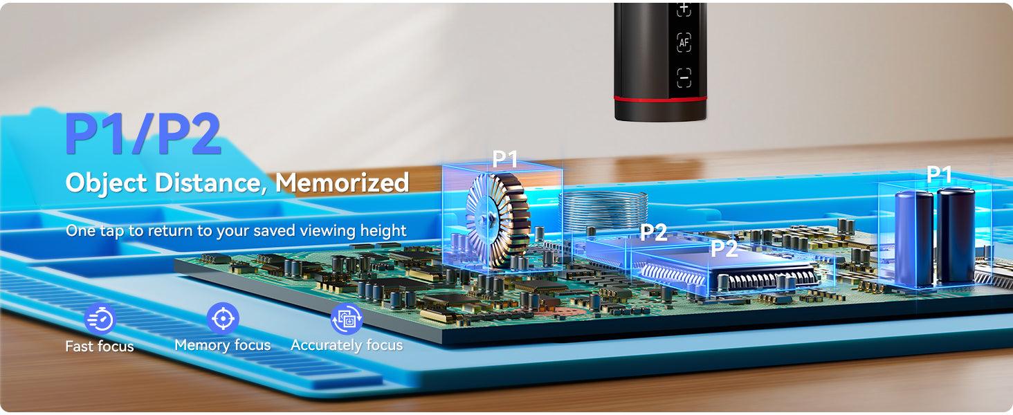 - P1/P2 Preset Memory Function: This soldering microscope with screen stores two preset focus heights and instantly recalls the saved viewing positions, ensuring consistent results during repeated soldering or inspection tasks