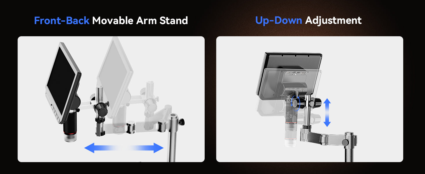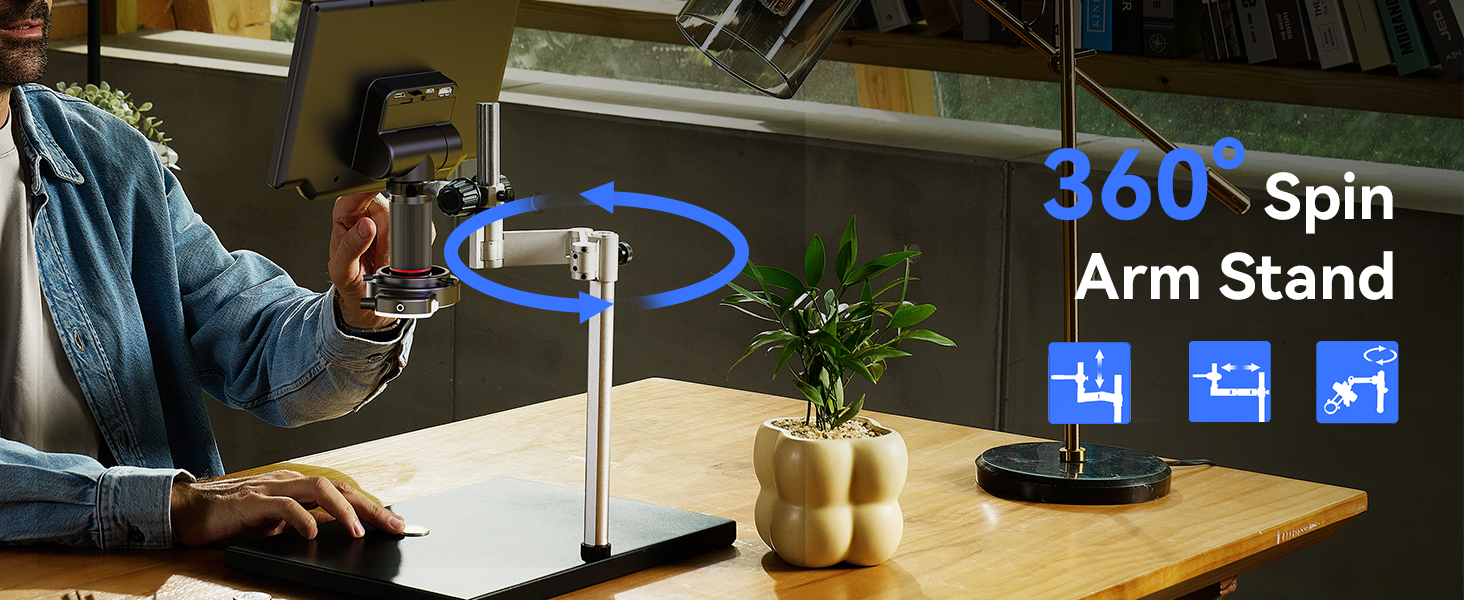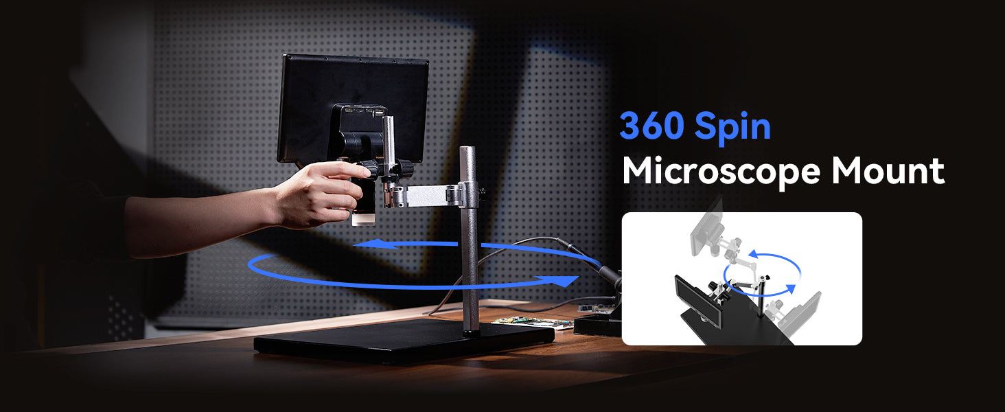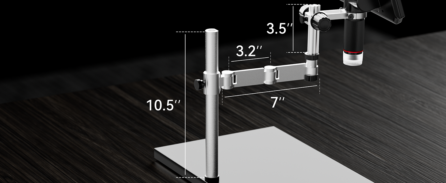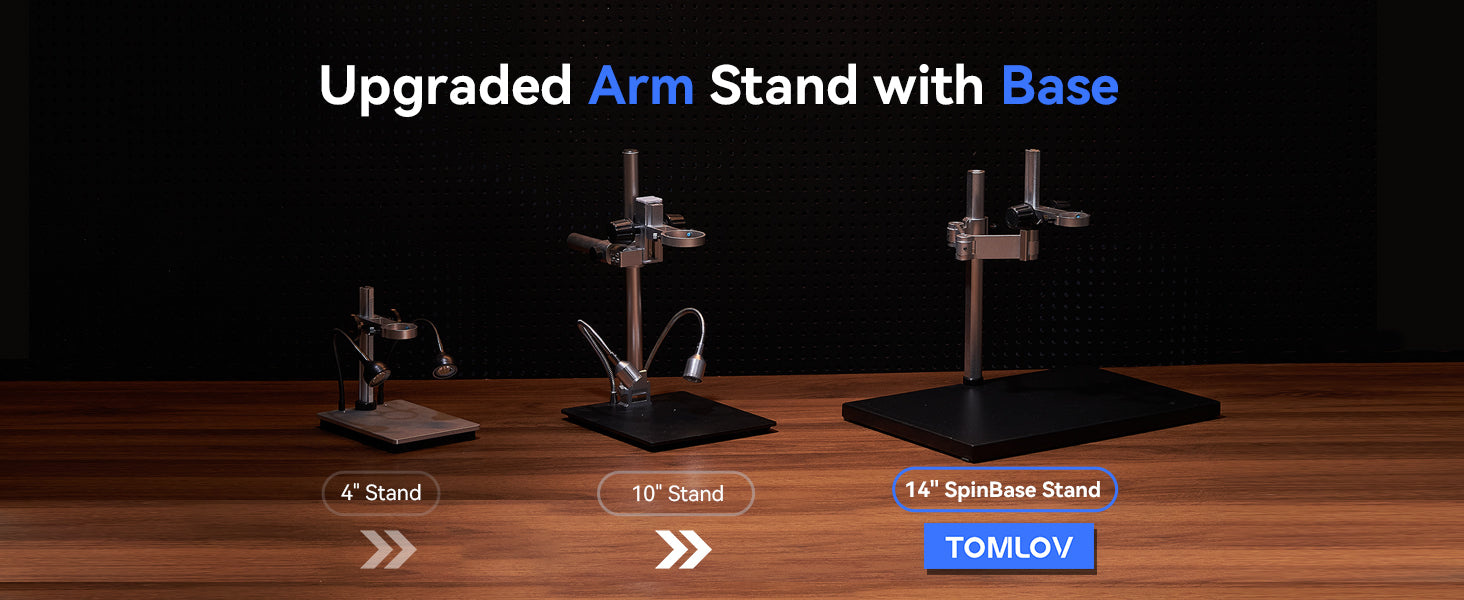 【360° Spin Arm Digital Microscope】TOMLOV TM4K Max soldering microscope redefines versatility,eyond vertical adjustment, it seamlessly adapts horizontally and rotates 360° for unmatched precision. The extended 13-inch pillar provides technicians with ample working height and space, while the accompanying 3.5-inch fine-tuning stand ensures effortless and precise repair work. Elevate your craftsmanship with a stand designed for flexibility and accuracy like never before.