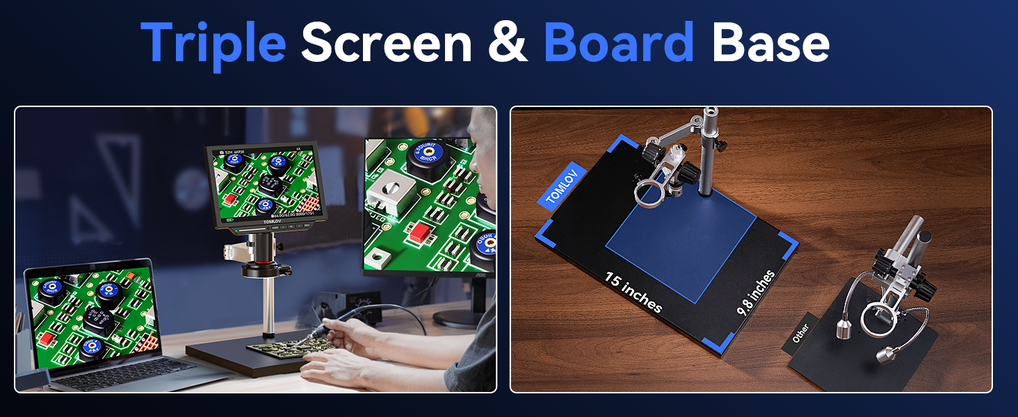 【 Tri-Screen Real-time Display Microscope】TOMLOV Soldering Microscope 2000X features a Tri-Screen Real-time Display, delivering simultaneous HDMI/USB output. Immerse yourself in a larger, more detailed view with the convenience of real-time monitoring on three screens,