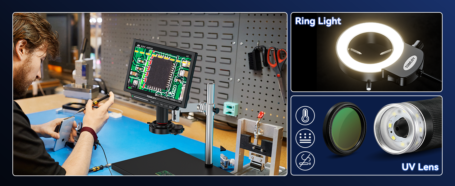 【Illuminate Ring Light Soldering Microscope】TOMLOV TM4K Max LCD Digital Microscope features a brilliant ring light that ensures exceptional brightness and uniform illumination, bringing every intricate detail to life. With a larger lighting area and heightened brightness, you can observe even the tiniest details with crystal-clear precision
