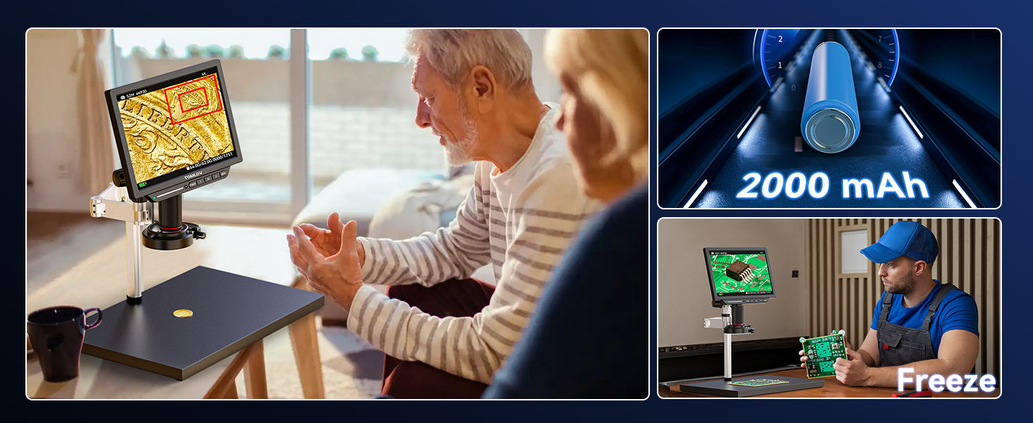 【 2000x Zoom Coin Microscope for Error Coins】Experience the TOMLOV TM4K Max Full View Coin Microscope with 2000x Zoom. Effortlessly zoom in and focus with a magnification range from 2X to 2000X, all within a fully-lighted view. Adjust the holder's height and rotate the knob on the 8-inch screen HDMI digital microscope to explore the tiniest details. Begin your journey into the micro-world now!