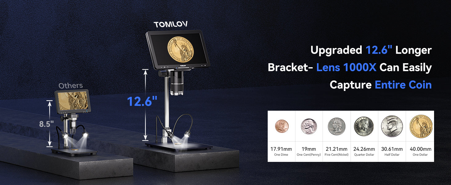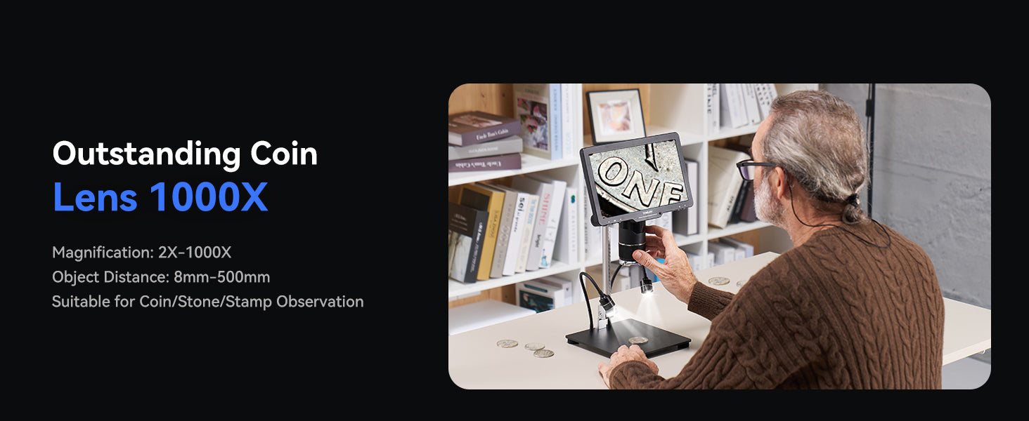 - 【Outstanding Coin Lens 1000X】The lens 1000X of this coin microscope with a magnification range of 2X to 1000X. Specifically designed for coin enthusiasts, this lens allows you to explore coins in remarkable detail, from minute local features to entire coins view. Effortlessly capture and analyze coins from one dime to one dollar. Ideal for numismatists, it offers unparalleled precision in observing coins, making it the perfect tool for your detailed study and collection.