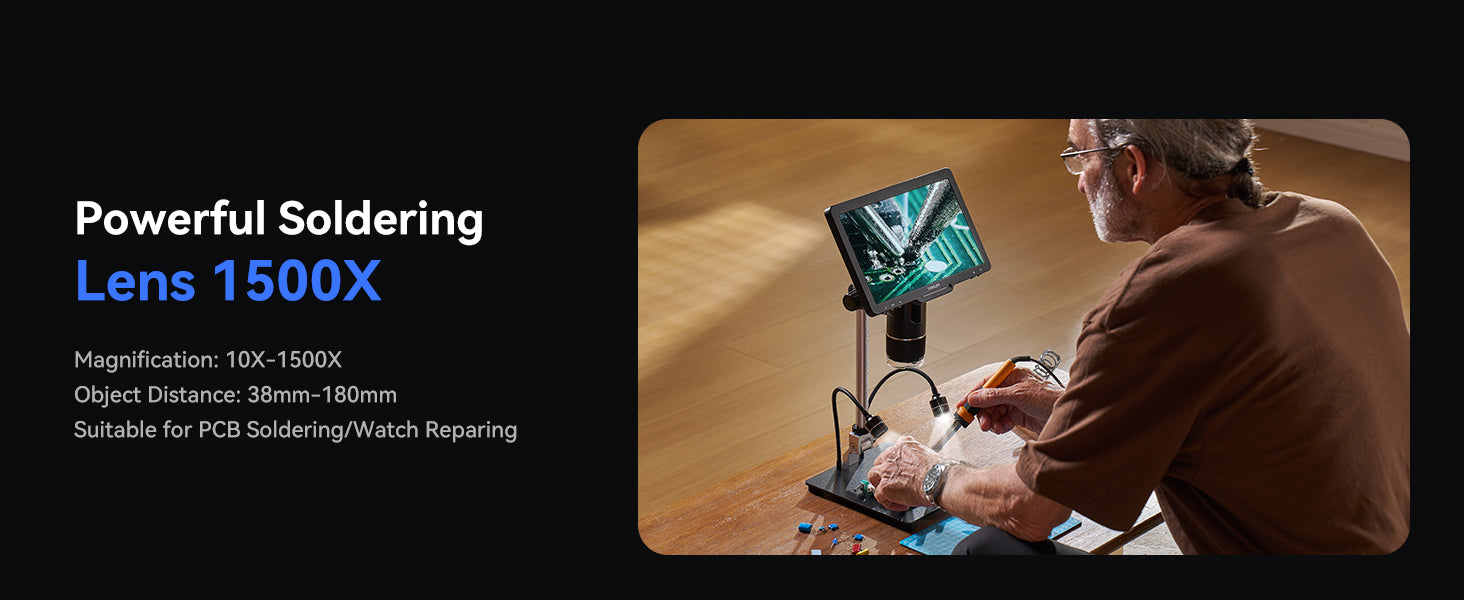 - 【Powerful Soldering Lens 1500X】The lens 1500X of this soldering microscope with a magnification range of 10X to 1500X. Perfectly suited for soldering work, this lens offers exceptional detail clarity, making intricate tasks easier and more precise. The longer bracket & larger base provide ample space for soldering operations, ensuring a stable and spacious work area. Ideal for precision tasks such as watch repair and soldering, this digital microscope is your go-to tool for high-precision work.