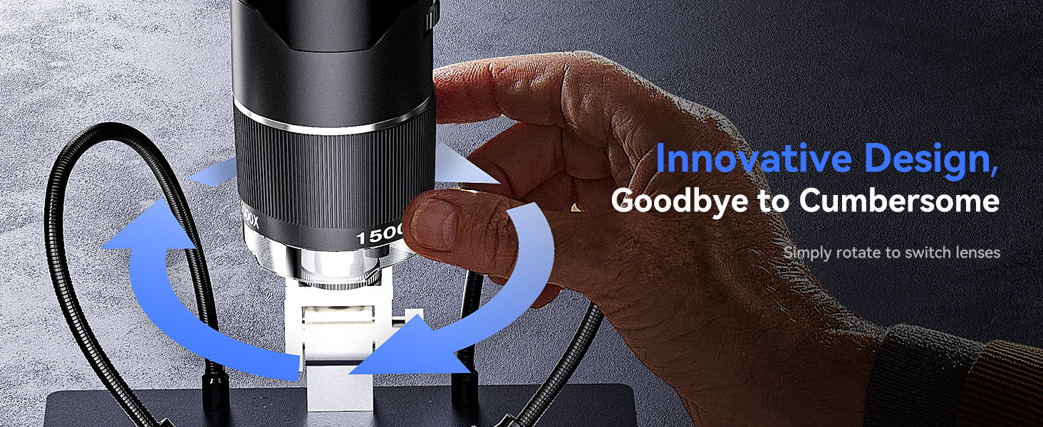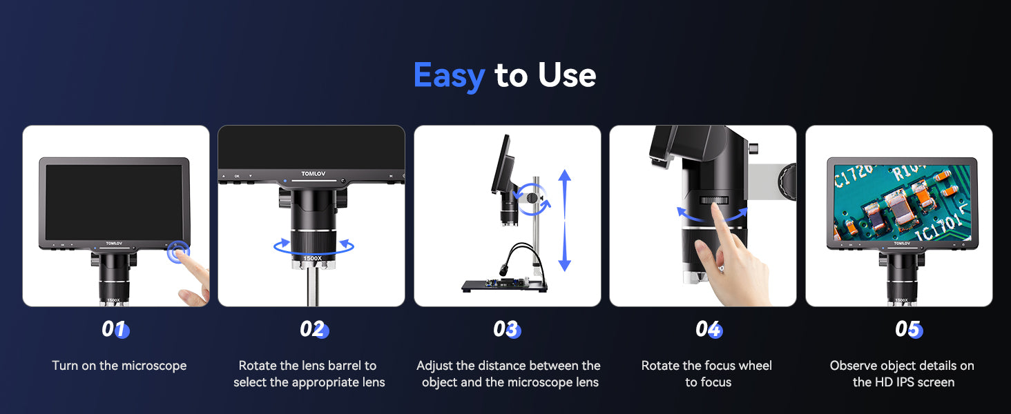 - 【Effortless Triple-Lens Switching】TOMLOV TriL110 3 lens HDMI digital microscope is designed for effortless versatility and unparalleled convenience. With a simple rotation of the lens barrel, you can seamlessly switch between three different lenses, eliminating the cumbersome process of manually changing lenses. This innovative design streamlines your workflow, allowing for quick adjustments and continuous observation without interruption, perfect for professionals and enthusiasts alike.