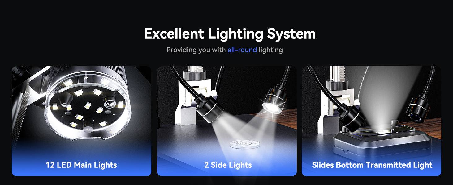 - 【Excellent Lighting System】Except the built-in 12 LED main lights around lens, this lcd digital microscope is also equipped with 2 gooseneck side lights and a slides bottom light. All three types of lights can be dimmed and charged independently to provide more excellent detail and optimal clarity in various environments and allow to capture picture or video in some dark places. Provides sufficient light, allowing you to observe the clearest details of objects in various environments.