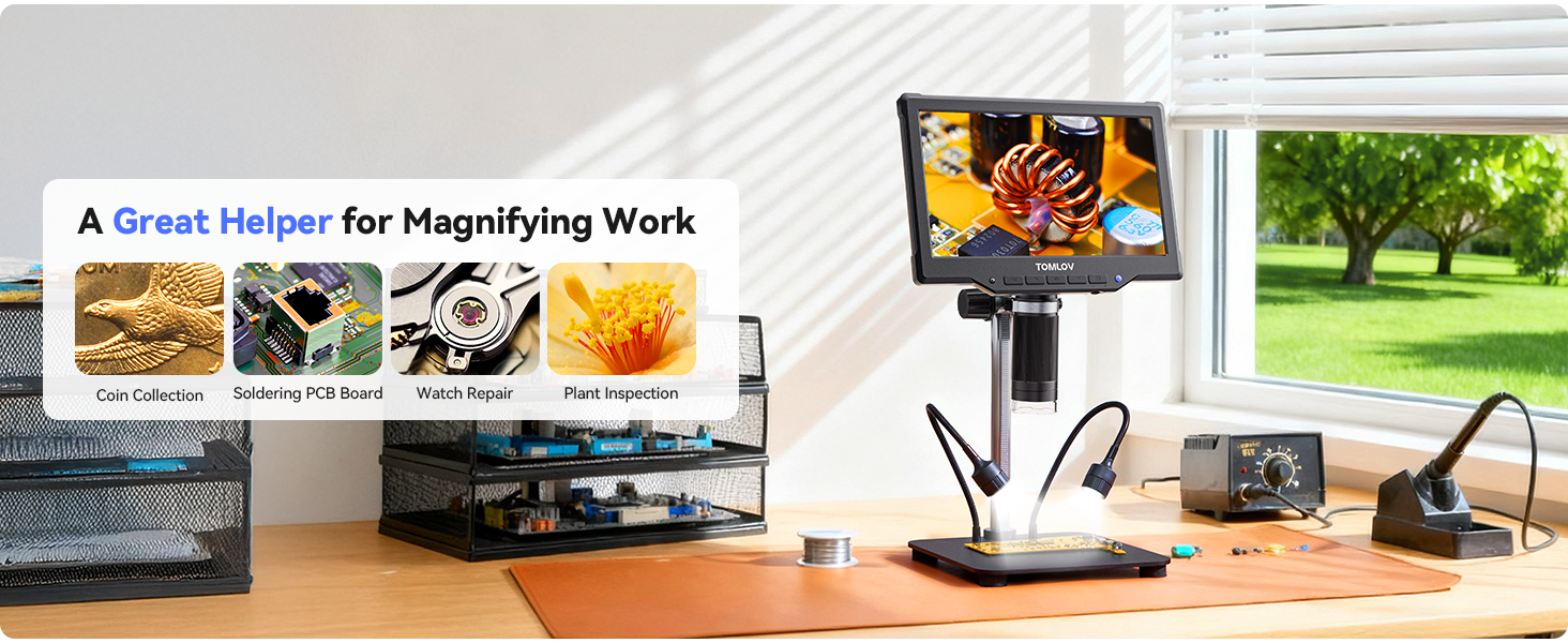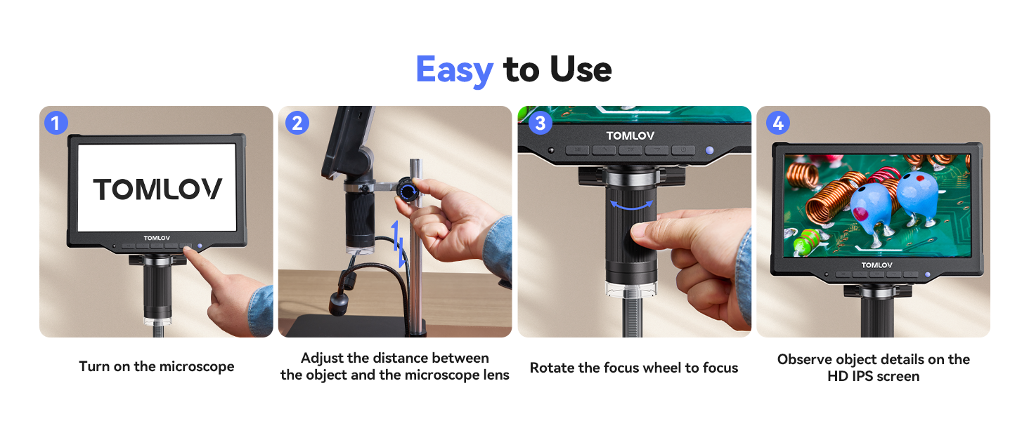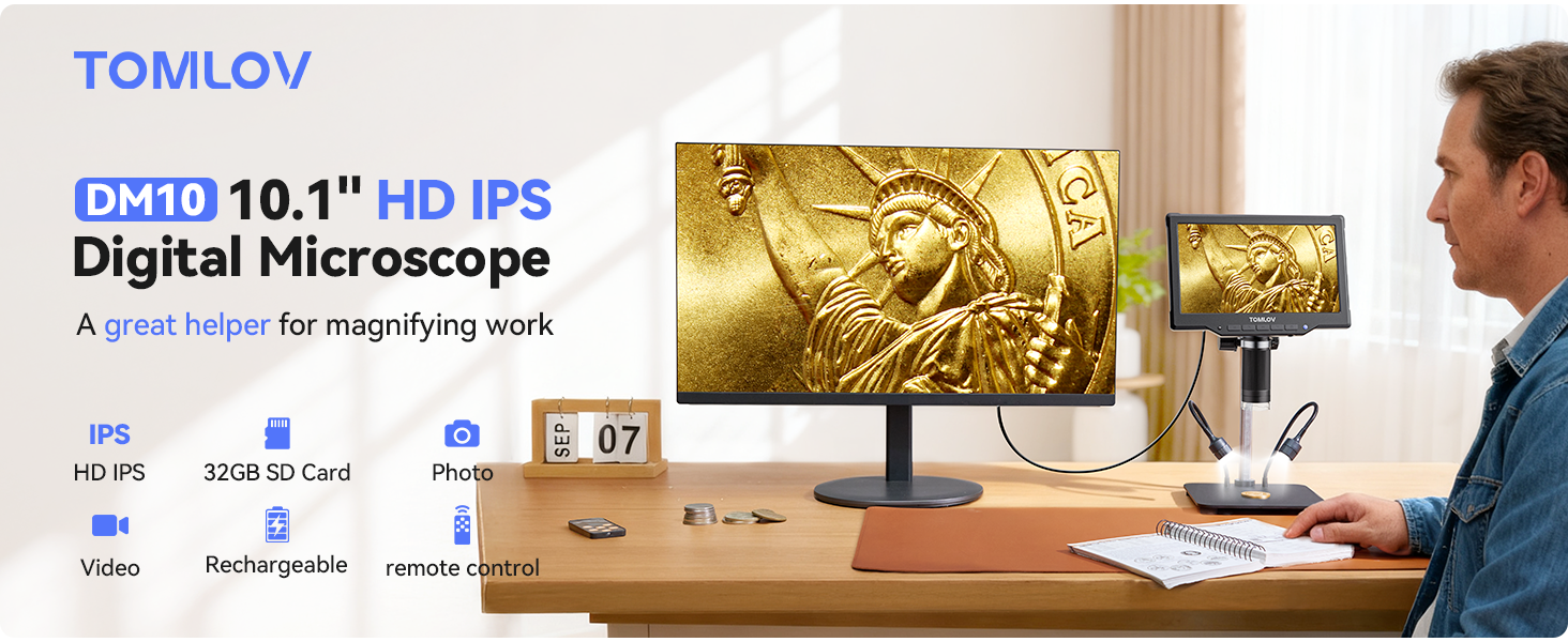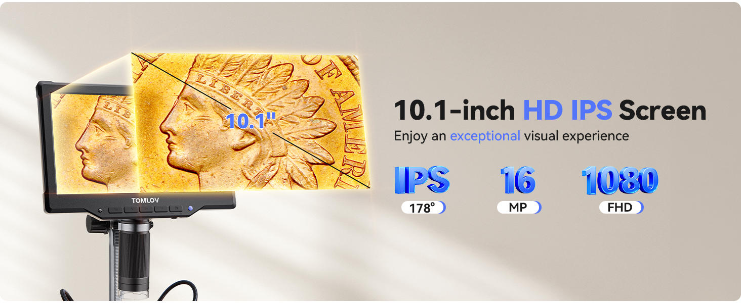 - Larger screen, More Details, Better Viewing Experience: TOMLOV DM10 digital microscope features a large 10.1" IPS screen with 178° wide viewing angle, revealing more details and delivering vivid colors and clear images from any angle